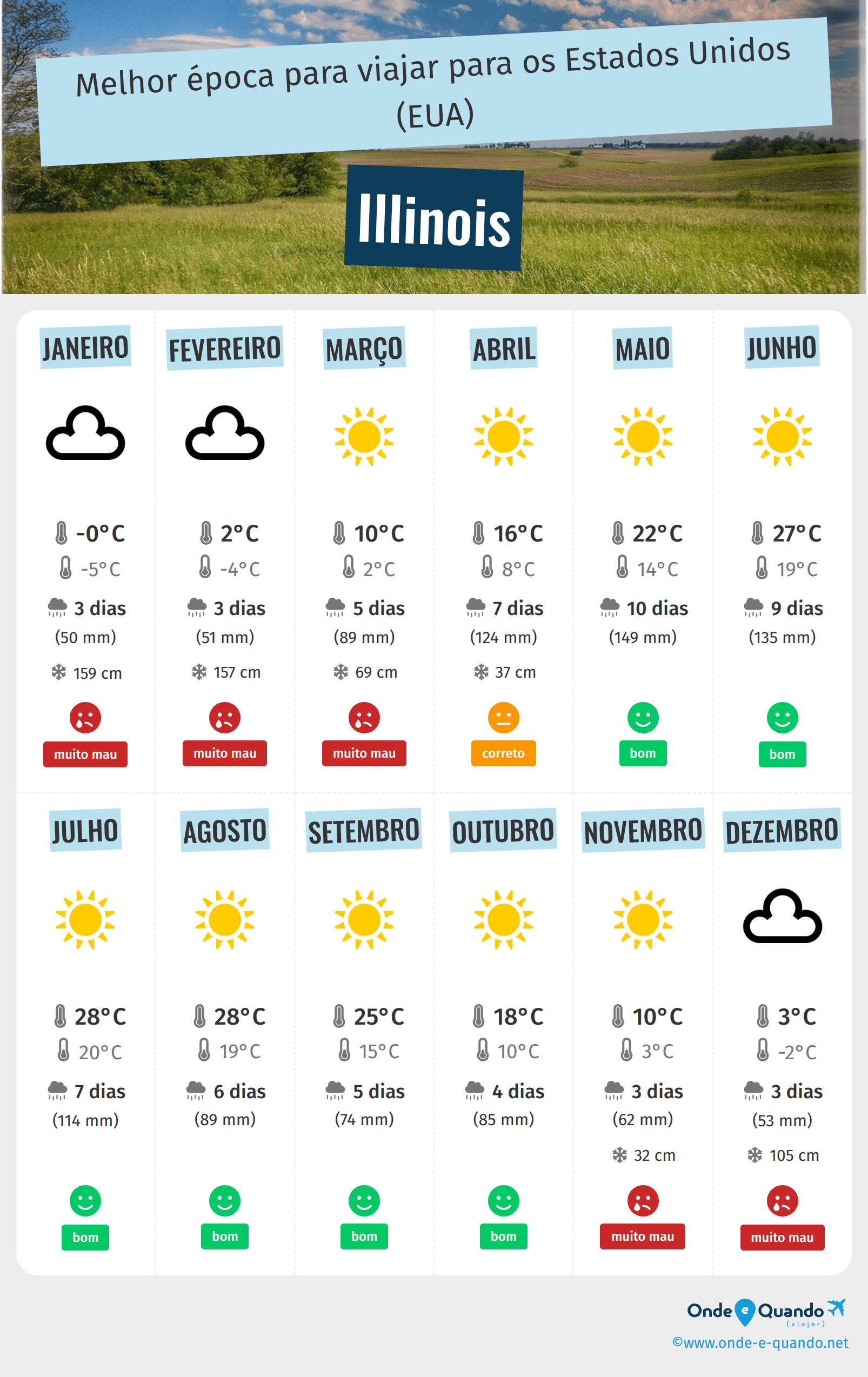 Qual é a melhor época para viajar para Illinois? Aqui tem algumas informações para o(a) ajudar na sua decisão de quando ir: