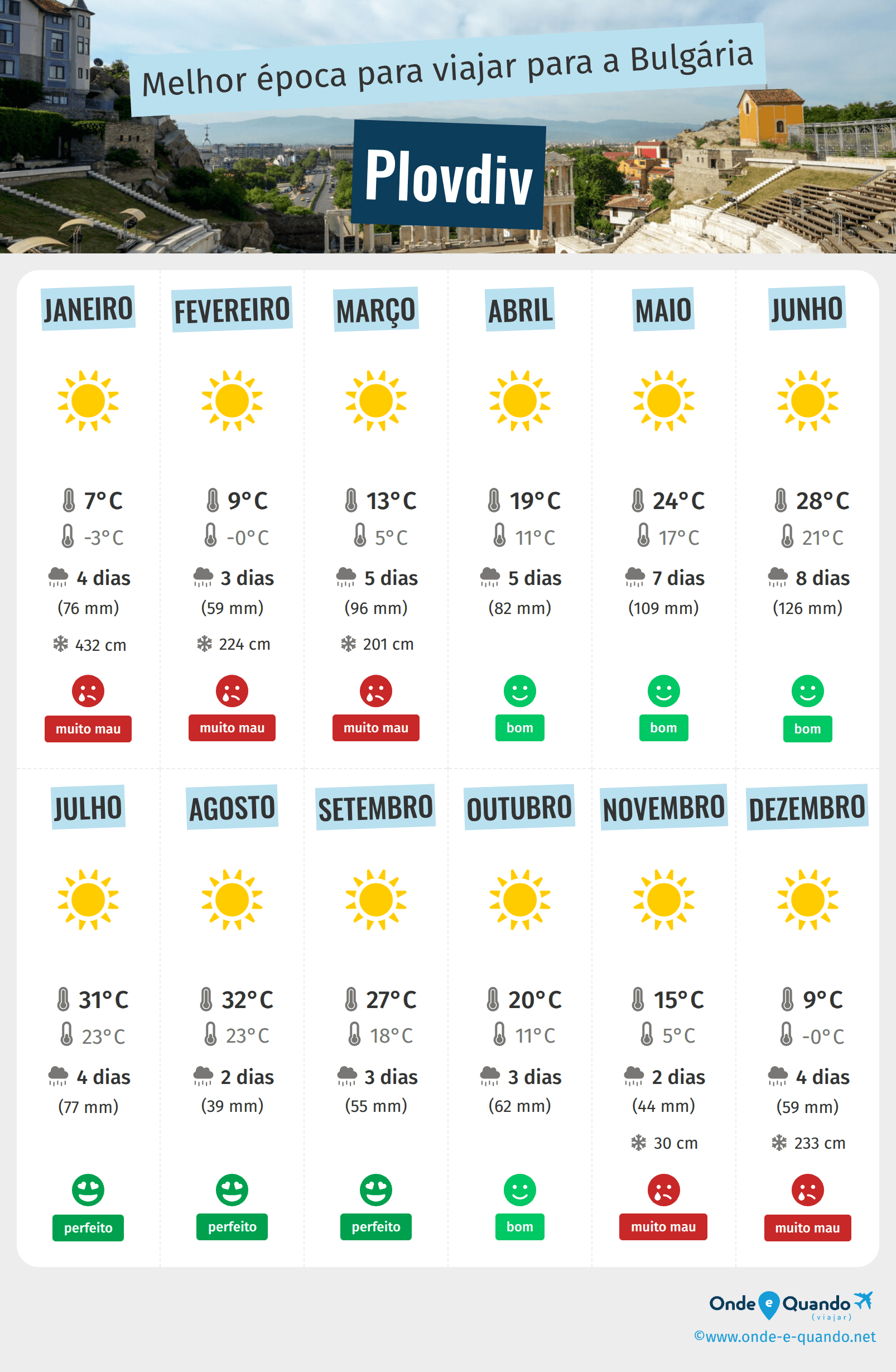 Qual é a melhor época para viajar a Plovdiv? Aqui tem algumas informações para o(a) ajudar na sua decisão de quando ir: