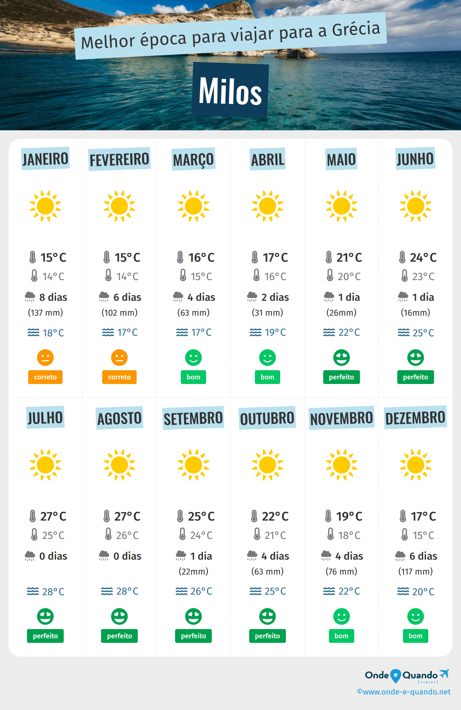 - Os meses de melhor tempo em Milos são Março, Abril, Maio, Junho, Julho, Agosto, Setembro, Outubro, Novembro e Dezembro